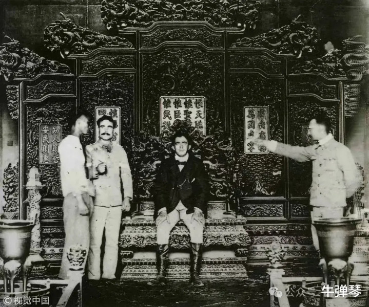 老照片里,也是在故宫,当年还是清王朝的皇宫。包括英国军队在内的八国联军攻陷北京,闯入紫禁城,一些士兵烧杀掠夺,甚至在金銮宝座上得意洋洋拍照,以此羞辱中国。